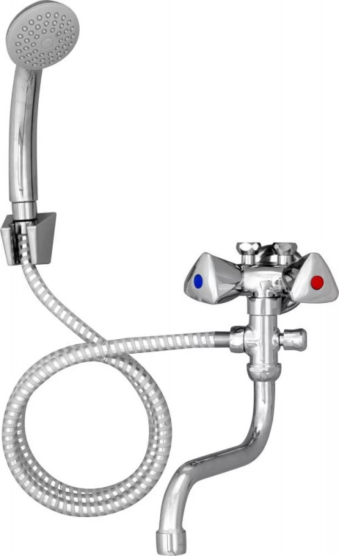 Vodovodní beztlaková nástěnná vanová klasická baterie, výtokové ramínko 18cm, sprchová hadice 200cm (bílá-chrom), ruční jednopolohová sprcha, držák sprchy a přepínač.
