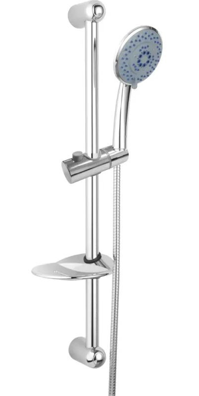 Sprchová tyč včetně mýdlenky, držáku ruční sprchy, tří - polohové ruční sprchy, nerezové hadice 150 cm. Pevné konce