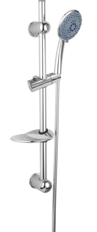 Sprchová tyč včetně mýdlenky, držáku ruční sprchy, tří - polohové ruční sprchy, nerezové hadice 150 cm. Jeden konec nastavitelný